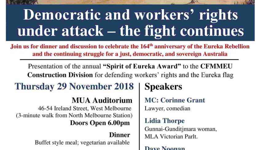 Join us for dinner and discussion to celebrate the 164th anniversary of the Eureka Rebellion and the continuing struggle for a just, democratic and sovereign Australia.