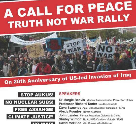 Hosted by the 18 March Peace Roundtable Rally Melbourne organisations:  No AUKUS Coalition Victoria, Pax Christi, IPAN-Victoria, Melbourne for Assange, Unitarian Church Peace Memorial, Spirit of Eureka, Solidarity, Students Against AUKUS, Anakbayan Melbourne, PASA, CICD, Melbourne May Day Organisation, ILPS, Extinction Rebellion West (Melbourne), and others.Join the rally – bring friends, family, workmates and placards. Publicise and share this post widely.