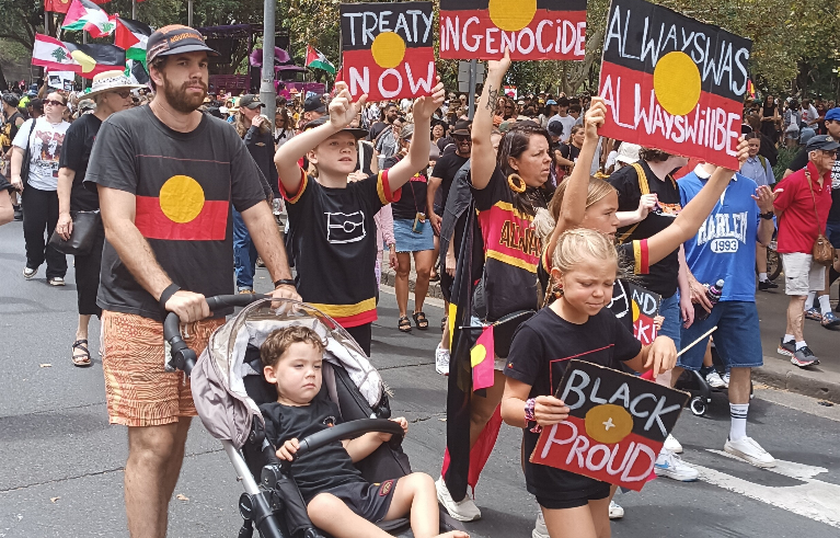 While the media conceded 25,000 in attendance, a more realistic estimate would be at least 45,000 and predominately young people. Many brought their own placards and banners, carried the Aboriginal Flag and frequently chanted, “Always was, always will be – Aboriginal Land!” and “No pride in Genocide!”