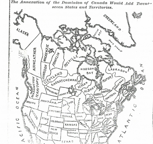 Financial panic distracted Washington from the 1837-8 rebellions in Upper and Lower Canada before Congress agreed in 1839 to a $10m. war budget and 50,000 conscripts, reviving schemes to bring Canada into the Union. Continentalists assumed that Canadians would rush to join the Land of the Free, apparent in the accompanying map from 1888.