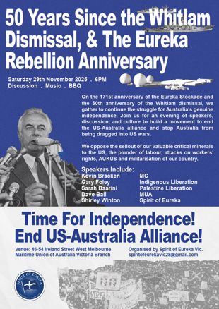 50th Anniversary of Whitlam Dismissal and 171st Anniversary of Eureka Rebellion. We reflect on the Dismissal (a US and UK semi-coup) as a reminder of the US and British political, economic and military domination of Australia, and we look to Eureka as a tradition of democratic struggle and anti-imperialist rebellion.