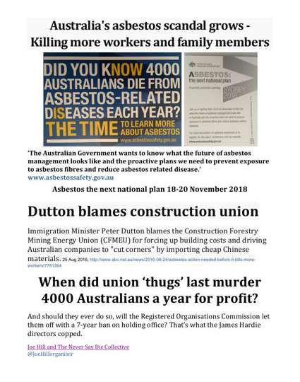 by Humphrey McQueen While this country struggles not to ban this killer, let never forget to add that on the Commonwealth’s own estimate, 4,000 Australians will die this year, and every year for a long time to come from asbestos related conditions. Killing for profit is no crime. The following few paragraphs are from McQueen’s, Framework of Flesh: Builders’ Labourers …